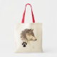 Visa en vacker varg-profil på en handväska. Ett paw-utskrift sluter bild.