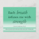 Varje andedräkt ger mig styrka. En kurs i Miracles-kort för att skicka hälsning och en välsignelse för andlig. Med vykort kan du eller de få kortet på visningen. Andlig kort om utandningskortet, för en meditator, inspirerande citat om utandningsluften. Skicka en välsignelse från andlig till en vän. Meddelandet i detta kort är " Se varje andetag som ger dig styrka ". Detta kan ersättas med ett eget meddelande om du så önskar. Kortets utformning är ett inspirerande citat från bok A-kursen i Miracles från andlig på en gröntens tematiska bakgrund. Det utökade citatet finns i kortet för meditation och reflektion under er tysta tid. "Mitt hjärta slår i Guds frid. Att omge mig är hela livet som Gud skapade i Hans Kärlek. Det uppmanar mig i varje hjärtslag och i varje andetag, i varje handling och i varje tanke. Fred fyller mitt hjärta, och översvämmar min kropp i syfte att förlåta mig. Nu är mitt sinne läkt, och allt jag behöver för spara i världen ges mig. Varje hjärtslag ger mig fred, varje andetag ger mig styrka. Jag är Guds budbärare, styrd av hans röst, understödd av honom i kärlek, och som för alltid hålls tyst och i fred inom hans älskande Arm. Varje hjärtslag kallar Hans Namn, och alla besvaras av Hans Voice och försäkrar att jag är hemma hos honom." Workbook Lesson 287, A Course in Miracles När du har personlig detta A Course In Miracles-kort med namn på din vän eller familjemedlem och ditt eget namn, skicka kortet direkt. Du kan också välja tom A-kurs i Miracles-kort som ska skickas när det behövs. Klicka på Förhandsgranska om du vill kontrollera att den anpassas efter behov. Designad av en student av en kurs i Miracles som en användbar påminnelse!