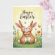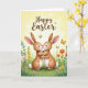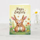 Det här kortet visar två långörda, kaninlika figurer i varmt brunt och krämigt vitt, som står tätt intill varandra i mitten med näsorna som vidrör varandra och slutna ögon 🐰. En svag rosafärgad rodnad på deras kinder och den mjuka kurvan av deras tassar runt varandra antyder en söt relation, som nära vänner eller ett kärlekspar. Runt omkring dem breder sig en våräng ut, fylld med små vilda blommor i blått, gult, rosa och orange, utspridda över den rika gröna gräsmattan 🌷. Himmeln ovanför tonar genom en mjuk gul glöd, vilket ger scenen en solig, tidig morgon-känsla. Nära toppen syns en säsongsrelaterad hälsning i flytande, djupt kakaobrun text, med stort mellanrum så att den tydligt syn