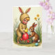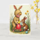 Uppfostrad med en mjuk, målerisk vårscen visar framsidan ett litet barn i en beige kaninliknande dräkt på knä i gräset, långa öron och en fluffig svans som ger ett milt och vänligt intryck 🐰. Bredvid barnet sitter ett litet brunpälsat skogsdjur tätt intill, med ansiktena vända mot varandra som om de delar en tyst och tillgiven upptäckt. Framför dem vilar en rustik bo gjord av gröna kvistar med små röda blommor instuckna, placerad lågt bland grässtråna. Inuti boet ligger ett överdimensionerat, glänsande rött ägg, och en liten solgul kyckling balanserar på toppen och drar båda figurernas stora ögon till sig. Bakgrunden är fylld med friska gröna färger, smala stjälkar och spridda gula blommor som mjukar upp scenen som morgonljus 🌷. En kort på