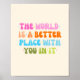 Vi presenterar vår pulserande och hjärtslitande skapelse: "Världen är ett bättre Ställe med er i den!" Detta designad för att skapa glädje och positivitet i ditt liv. De nyvalda nyanserna blandas på ett harmoniskt sätt för att skapa en bild som kommer att göra utrymmet ljusare. 🌍 inspirationsbudskap: Kärnan i den här utformningen är ett kraftfullt budskap som når alla som läser den. "Världen är en bättre Ställe med dig i den" är en daglig påminnelse om det enorma värde du tillför världen och livet för dem som omger dig.