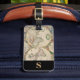 Bagagetagg med en klassisk världskarta över vintage resor, inledande mongram/namn på ett svart rand-monogram ram, namn och adress på svart bakgrund. Anpassa med dina inledande/inledande/inledande/inledande/namn, namn och adress med hjälp av de enkla mallarna. Teckensnitt färg, typsnitt stil, storlek typsnitt och svart bakgrund färg är anpassade.