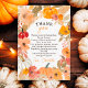 Gratulerar till höstens mysiga charm med vår varma Boho Little Pumpkin Fall Baby Shower tack vare ditt kort! Denna gender-neutralt-utformning visar en vackert handmålad blommigt-andedräkt som är sammanflätad med rustiska pumpor och spolblad i varma skuggor av orange, grönt och brunt. Det moderna och redigerbara skriptteckensnittet gör att din inbjudan får en personlig beröring. . Perfekt för välkomnande av din lilla pumpa till världen!
