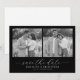 Denna bröllops-"spara datum"-design har en tudelad komposition med två svart-vita fotografier av ett par i en utomhusmiljö, som fångar ögonblick av intimitet och samhörighet. Den monokroma färgpaletten betonar klarhet och detaljer, vilket skapar en tidlös och elegant look. Designen inkluderar en kursiv typsnitt för "spara datum" och rena serif-typsnitt för anpassningsbara evenemangsuppgifter, vilket ger en personlig touch till denna enkla men sofistikerade mall. Perfekt för att förmedla värme och tillgivenhet, sätter den tonen för en minnesvärd fest.