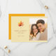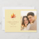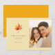 Denna bröllopsinbjudan har en delad layout med en konstnärlig lönnlöv-illustration till vänster, utförd i varma höstfärger i rött, orange och gult. Höger sida visar en platshållare för ett foto av ett par, mot en ljusbeige bakgrund som kompletterar den övergripande mjuka färgpaletten av gult och krämfärg. Designen blandar modern minimalism med rustik charm och använder eleganta serif-typsnitt för att visa anpassningsbara detaljer som namn och datum. Dess mysiga och intima stämning gör den perfekt för att fira kärlek och engagemang.