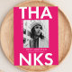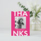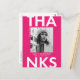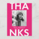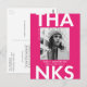 Trendig, modern examens tacksamhet vykort med examen fotot med "Tack" i djärva vita bokstäver och varm rosa bakgrund. Anpassa framsidan av examens fotots tack vykort genom att lägga till examen namn, skolans namn och examensår. Baksidan av examens foto tack kortet har din returadress med utrymme för ditt maskinskrivna eller handskrivna meddelande.