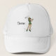 En söt ung kvinna som bär grönt kort och en tammy utövar sitt golfsving bredvid skript - brukligt namn