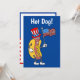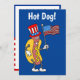 Varmkorv! Det är en 4 juli-fest rolig inbjudan till en 4 juli-fest. En rolig inbjudan till en självständighetsdag fest, picknick, grill eller grillfest. Perfekt för en trädgårdsgrillfest! Den har en tecknad varmkorv som bär en patriotisk hatt och håller en amerikansk flagga!