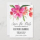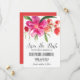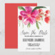 Anpassningsbart spara datum tillkännagivande med varmröd och korallfärgad vattenfärg blommor. Detta är en del av en brölloppsserie, matchande artiklar finns tillgängliga.