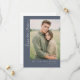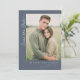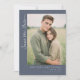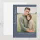 Denna design för brölloppskort "Save the Date" har ett centralt foto av två personer i en utomhusmiljö, omgiven av högt gräs, inramad inom en rektangulär kant på en dämpad mörkgråblå bakgrund. Layouten är vertikal med elegant kursiv stil i det övre vänstra hörnet med texten "Save the Date", och anpassningsbara textelement för namn, datum och plats placerad strategiskt längst ner. Färgpaletten inkluderar naturliga gröna toner från fotografiet, kompletterat med neutrala grå och vita toner i texten, vilket skapar en modern minimalistisk stil med rustik charm. Typografin kombinerar serif- och sans-serif-teckensnitt för att leda uppmärksamheten smidigt över designen, och väcker värme och förväntan. Perfekt för par som vill dela sin glada nyhet