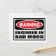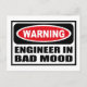 Varning INGENJÖR I BAD MOOD-vykort kan du anpassa på www.WarningSignShirts.com och har en röd och svart varningsskylt och INGENJÖR IN BAD MOOD i fet svart brev för att varna världen. Du kan också anpassa ditt eget varningsskylt vykort med den text du vill ha.