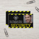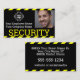 Det här affärskortet har en professionell med en "SECURITY"-titel som är tryckt i skarp gult över grund-delen över en svart bakgrund. Ett exempelskyddsfoto placeras på högerna som du kan anpassa för att inkludera ditt eget foto-ID. Ett företag eller en logotyp som ingår i urvalet placeras på den lämnat, följt av en anställd och ett företag namn. Säkerhetsföretaget eller den fasta informationen och kontaktinformationen placeras på baksidan. En ljus gult och en svart strimlad försiktighet tar bort gräns och grund.