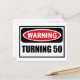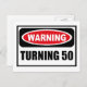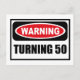 Varning VID 50-vykort som du kan anpassa på www.WarningSignShirts.com och som innehåller ett rött och svart varningstecken och TURNING 50 i fet svart brev som varnar världen. Du kan också anpassa ditt eget varningsskylt vykort med den text du vill ha.