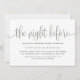 Ange tonen för en minnesvärd kväll med Anpassadet Rehearsal Middagsinbjudan, som innehåller eleganten "Natten före" i vismskript. Den här eleganten är en inbjudan till en repetitionsmiddag designad för att fånga kvällens upphetsning före den stora dagen. Oavsett om du är värd för en liten, intim samling eller ett större firande, är denna inbjudan till bröllop-repetition perfekten till inbjudan dina närmaste vänner och familj för att i magin. Anpassa inbjudan med din händelseinformation, inklusive datum, tid och plats.
