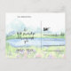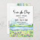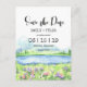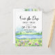 Vacker naturinspirerad bröllopsinbjudan "Save the Date" med en landskapsvy av akvarellsceneri av idyllisk natur på våren med bergskedja, fridfull sjö och blommande äng för en inspirerande utomhusceremoni. Unikt typsnittslayout både på framsidan och baksidan av kortet gör denna design verkligen speciell.