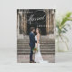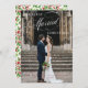 Ett kort för elegant helgdag för att fira dina första helgdagar som gifta par. Ditt favoritfoto är täckt med "vår första gifta jul" hälsning i vitt skript. Logga ut med ditt nya gifta namn med rött serif-teckensnitt. På andra sidan finns en mönster av vattenfärgsbär och löv.