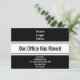 Överst finns det en visning som du kan ersätta med företagets logotyp. I mitten finns en svart visning för ett anpassningsbar-meddelande (visas: Vårt kontor har Flyttat). I grund finns det linjer visning text som du kan redigera för att ny adress. Kortet är svart och vitt.