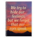 Låt din känslor flöda ut på den här inspirerande bärbara datorns sidor. Den här anteckningsboken innehåller ett hjärtligt citat: "Vi försöker gömma våra känslor, men vi glömmer att ögon talar", och den är perfekt för att journalföra, planera eller helt enkelt reflektera. En tankefull gåva till författare, studenter, eller någon som känner sig djupt och värderar självuttryck.