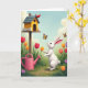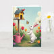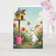 Denna kortdesign präglas av en lugn vårträdgårdsscen med en vit kanin som står upprätt i gräset med huvudet lutat uppåt, som om den beundrar två orange-svarta fjärilar som svävar ovanför 🐰. Runt kaninen reser sig rader av tulpaner i rött, orange och mjukt lila på gröna stjälkar, vilket ger en mysig och vänlig stämning som en promenad med någon nära 🌷. Till vänster sitter en liten gul fågelholk på en träpåle, krönt med ett mörkt tak och en liten vit staketdetalj som känns som ett litet hem. En lysande röd fågel sitter på taknocken, riktad mot kaninen som om den vakar över ögonblicket. Nära basen på pålen vilar en rosa vattenkanna i gräset, vilket antyder omvårdnad och tyst tillsammanshet. En slingrande stig av ojämna stenplattor leder genom trädgården och drar blicken djupare in i scenen under en blekblå himmel med mjuka moln. Greeting