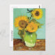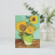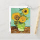 Ett vykort med den Post-Impressionistiska målningen, Vas med tre solblommor, med ljusa solblommor i gult i vas mot akvaribakgrund. Vincent van Gogh (1853-1890), en nederländsk konstnär, som skapat en slående kontrast mot bakgrunden, använde djärvt och intensivt färg för att skildra solblommorna, med sina gulter och bruna centra. Målningen är känd för sina dynamiska och tjocka penseldrag, kännetecknande för Van Goghs unika stil.