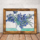 A fine art poster featuring the post-impressionist masterpiece Vase with Irises (1890) by Dutch artist Vincent van Gogh (1853-1890), showcasing a serene still life of vibrant irises arranged in a white pitcher set against a simple white background.