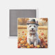 En vattenfärgsmålning stil av ett muntert sitta i hund i en hög av pulserande höst löv, omgiven av små pumpor och spridda hörn. Hund bär lite pilgrimhatt och beams med glädje, och fångade Thanksgivingens anda. I bakgrunden skapar mjuk skörd fält och träd med gyllene hud en fredlig landskapsambians. Struktur och varma, nedsmutsade hösttonar ge är en mysigt, nostalgisk perfekt för att fira säsongens skönhet.