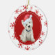 På framsidan av denna julprydnad är en vacker vattenfärgbild av en vacker Väster Highland White Terrier med en röd julhatt. Bilden placeras på en röd cirkel som ramas in av en retroröd snöflinga mönster på en vit bakgrund. Baksidan av dekorationen har samma bakgrund och cirkel med anpassningsbarna vit. Cute, särskilt för någon som kärlek en Westie.