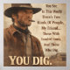 En robust cowboy röker en cigarr medan ett berömt citat om vapen och grävande visas. Den sepia tonen ger bilden en vintage-känsla.