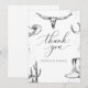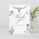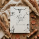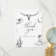 Visa din tacksamhet i riktig westernstil med detta rustika cowboybryllop-tackkort. Designat med en varm ökenbrun bakgrund och eleganta vita illustrationer av en långhornad skalle, kaktusväxter och klassiska cowboy-stövlar, kompletterar detta kort perfekt ett western-, ranch- eller landsbygdsinspirerat bröllop.