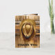 Western Bröllopskort för tack - har en elegant, rustik dörr med detaljer i levande trästruktur. En stor brun cowboyhatt i suède hänger på dörren. Nedanför används ett västerländskt tema för typsnittet för demotexten "Tack". Insidan av demokortet för tack-kortet har samma dörr med gammalt, gult papper som hänger från den med en röd häftstift. Du kan ändra typsnitt, storlek, färger eller till och med formuleringen till vad du än föredrar. Du kan också flytta runt textrutorna eller lägga till fler om du vill. Använd knappen "Anpassa" nedanför demoinbjudan. Om du är nöjd med typsnitt, färg och storlek, använd bara funktionen "Personalisera" till höger om demoinbjudan för att komma igång. Demokortet är inställt på grundläggande bröllopsinbjudan papper, om du vill linne eller andra finare kvaliteter, använd den orange "Anpassa"-knappen för att göra nödvändiga änd