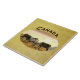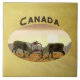 Två karibou-tjurar brottas under nedgången längst norrut medan sol går i bakgrunden. Text som läser "Kanada" visas också. Bilden läggs ovanpå en braintanbakgrund i läder.