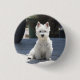 Vit Westie eller den västra höglands- terrieren sitter på trottoaren framme av en Planter. Hans skina blåtiror ser vänliga, och hans fluffiga lag gör honom kelig och petable.
