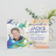 Mättnader i flödet av flytande färg genom inbjudan som består av blues och gröntar och som går till taupe och gråa. Ett cirkelformat fotofönster finns i mitten. Lämpligt för alla åldrar.