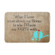 Det är ett fint badmatt som säger: "Det jag kärlek mest om mitt hem är vem jag mina fars med." Trämbakgrund med hjärta och kärlek till fågelklippskonst.