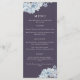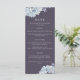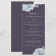 En elegant bröllop-meny med dammiga blå vattenfärgsblommor i en marin blå bakgrund, personlig med namn och bröllop. Menyinformationen är vit.