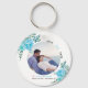 Aqua blåa blommor, grönt lövs och Photo Save the Date Photo keychain. En underbar design som visar ett foto, aqua blåa blommor i det övre lämnat hörnet och grund högernas hörn, texten "Spara datum" i svart och blå och ett hjärta för rosa.