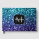 Sparka gäst bok för dam. Anpassa med ditt första och namn. Vackerlig, glamorös mörk och ljusblå glansig glitter sparkles aqua lila ombre. Foto av cyan och mörk blått gnistor är inte glitter!