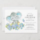Beklagligt glad elefant med söt blåa blommor-babyduschinbjudan till en pojkbabydusch.