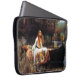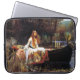 John William Waterhouse Dam i Shalott laptop sleeve. Oljemålning på arbetsyta från 1888. Dam i Shalott är en vacker förRaphaelitmålning av en scen från Alfred Lord Tennysons dikt i samma namn. Målningen visar den döende Dam av Shalott som seglar mot Camelot i en liten båt som är skrapad med ett vackert rödband som hon frodas när hon faller i kärlek med Lancelot. I båten sitter tre ljus och en crucifix som flickan tittar bort från. dam är själv klädd i en ljusblå medeltida klänning som är broderfull med guld. Hennes hår är ljusbrynt och hon håller båtens kedja medan den pressar iväg från dockan till ryttarna och lila dynor bortom. En underbarare gåva till fläkt av John William Waterhouse, PreRaphaelites, romansk engelsk målning och Artrituran Legend.
