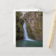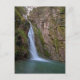 Härlig vattenfall som omges av klippor och shruber i djup skog.