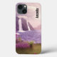 Ett telefonfodral med en scenbild av en fredlig lila sjö. Omgiven av lush cherry träd och vattenfall.