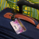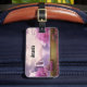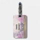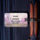 Ett bagagetagg med en scenbild av en fredlig lila sjö. Omgiven av lush cherry träd och vattenfall.