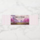 Etiketter för vattenflaska av händelser med en scenbild av ett fredligt lila sjö. Omgiven av lush cherry träd och vattenfall.