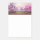 Fästande anteckningar med en scenbild av en fredlig lila sjö. Omgiven av lush cherry träd och vattenfall.