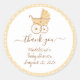 Vattenfärg bebis shower klassisk rund dekal som kan användas som kuvertförsegling på de tack-kort du skickar ut till gästerna eller dessa kan användas som en del av presentförpackning eller på partifavoritpåsar eller lådor. Dekalerna kan anpassas med inkludering av ett namn och datum för shower. Dekalen har en söt minimalistisk vattenfärg barnvagn.