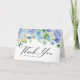 Whimsisk och elegant tackkort med blå och lila vattenfärg hortensior, peonior, anemone och lövverk. Detta personliga blomsterkort är perfekt för personligt bruk och speciella evenemang som bröllop och examen.