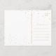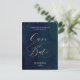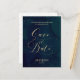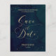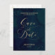 Ett kalligrafi "spara datum" vykort har en mörkblå akrylfärg bakgrund med texten i guld.