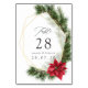 Trendiga rustika julbröllop bord nummer kort med guld geometrisk ram och handskriven typografi med slädklockor, julstjärna blommor, järnek, mistel och tall