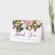 Dessa stilrena tackkort för bröllop har vackra vattenfärg blommor i rosa, grått, vitt, lila och orange, och en strö av rosa falskt glitter. Elegant lila typografi säger "Tack". Insidan är tom så att du kan lägga till ditt eget meddelande. Blommig konst av www.createthecut.com.