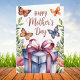 Denna design är komplett med en vattenfärgsillustration av fjärilar, grönska, blommor och en present. Orden "Grattis på mors dag" visas också på framsidan av kortet. Inuti kortet står det "Mamma, du är min fjäril - graciös, stark och full av kärlek". Du kan ersätta detta med din egen hälsning om du vill. Njut!